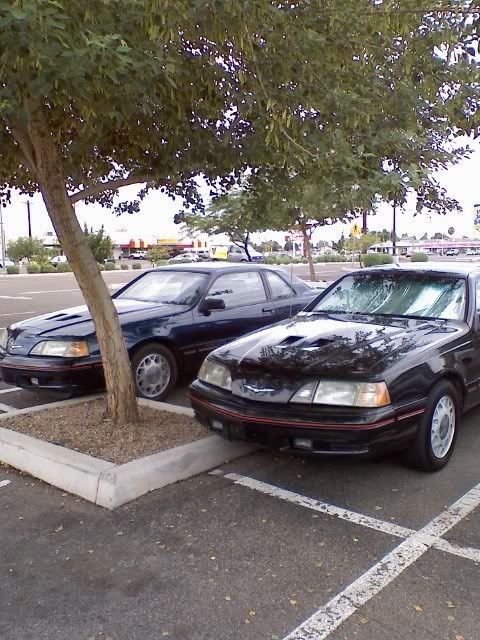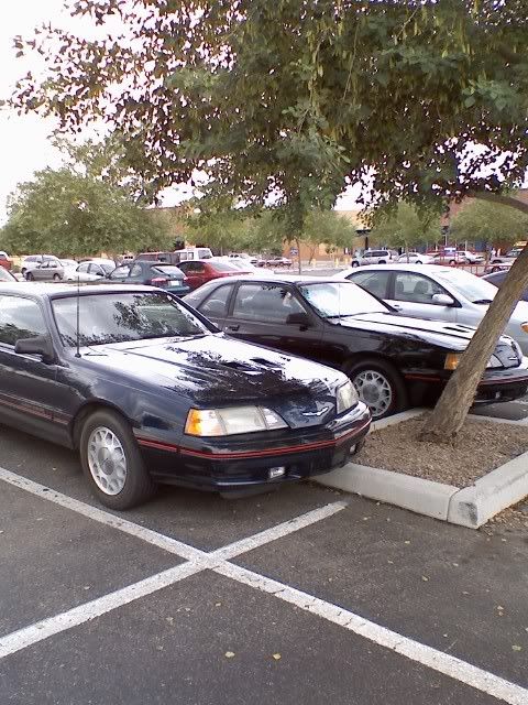 So I'm at work... August 28, 2007, 02:02:16 AM Working outside in the Garden Department when all of a sudden in the corner of my eye I spot something. It appears to be a dark blue Turbo Coupe at the far end of the parking lot. I run outside, ignoring the customers around me to check it out. I can see the car circling around the far end of the lot kind of where my car was parked. Then it appears to park right next to my car. At this point, I figure the occupants must be in the know.Two people get out. An older guy and woman, maybe in their late 40's to early 50's. Both of them are glancing over my car, pointing at it, and muttering stuff to themselves. I was hoping to chat with them, but they never made it over to my side of the Building. The good news is that I was able to convince a fellow worker with a Cell-phone camera to snap a few pictures of proof that this actually occurred. What I can gather from the photos is that it's a 5 speed and that it's blue. Quote Selected
