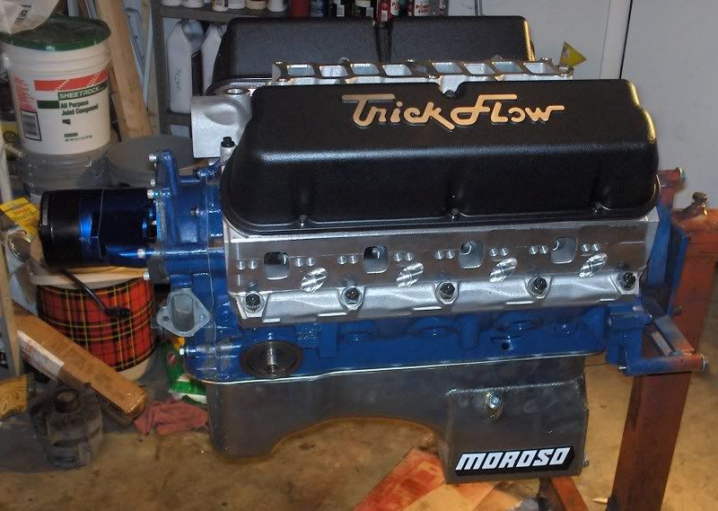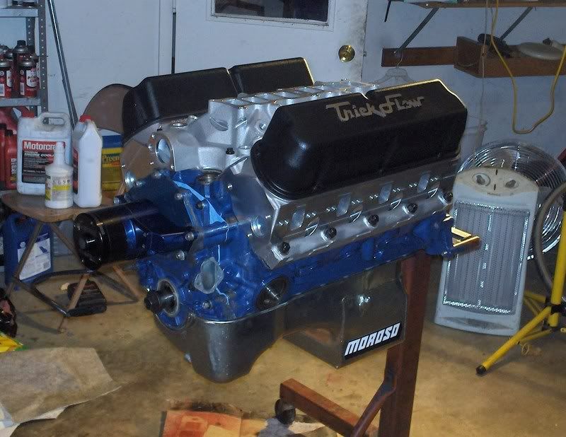 well the engine is finally done. or done enough ill consider it done. lol. the car itself still has a lone way to go, trans, rear, and suspension, but the biggest part of the project is over with. i still gotta buy a torque convertes, trans input shaft and headers before i drop her in, but its getting close. heres some pics just for a lil update and for me to show off a little :D  i think i earned it tho.