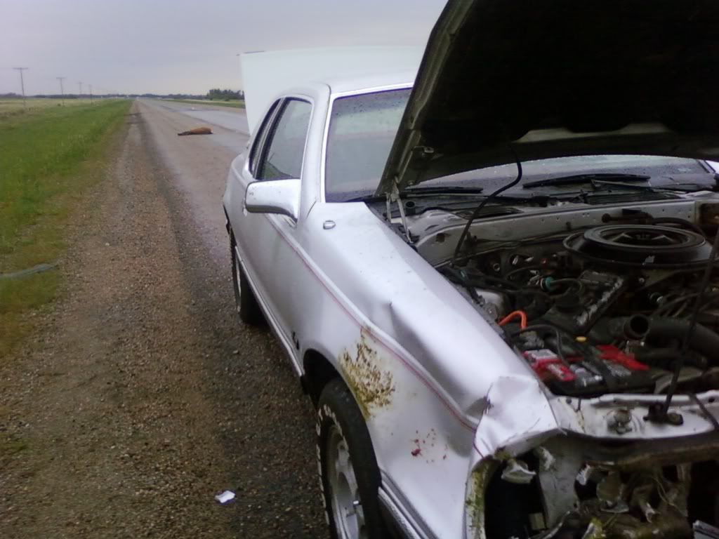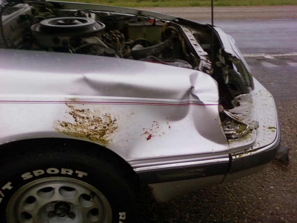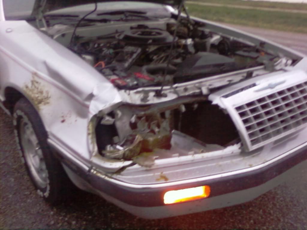 T-Bird: 1 Deer: 0 Reply #11 – June 20, 2009, 11:05:23 AM Well that curled part of the fender cut the belly open on it, hence the shiznit and blood, theres also hair everywhere. The bumper survived however the turn signal is crack which sucks because it was clear and crack free, but I have bigger problems right now than a turn signal cover. My game plan right now is find a rad at a junk yard out here and take it to my dads and start tearing it apart. I might have to throw a fender and a headerpanel on and then fix the rad support down the line, not the smartest thing to do but its my only way of transportation right now as the Cougars motor is blown. I need money and quick; I should win the lottery like my old man did, that solved some of his problems. Quote Selected