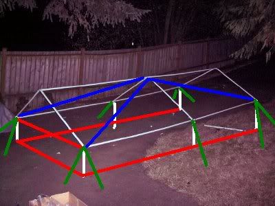 Car Canopy + Heavy Winds = Bad Reply #7 – March 19, 2010, 11:48:05 AM Heres a quick and crude mock up of ideas for reinforcing the frame:Lower red would probably be wood, to allow for further and future attachments or hold downs.Upper red could be wood, pipe or pvc (depending on structural needs to be determined)blue would probably be pvc, just for extra stiffening and to hopefully get rid of some drooping in the roof tarping.green is tie downs that would go in the ground, or attach to the fence.Legs filled with cement and fitted with rebar to provide extra strength, and more importantly~Weight.Throwing the idea around in my head of digging holes into the ground and fitting pipes that the legs would fit into, Similiar to how you seat a flagpole.But... One side i would have to go through concrete to do this.I could also have the rebar sticking out of the legs as the cement in the legs dries, thus making the need for the "socket" hole in the ground much smaller. Quote Selected