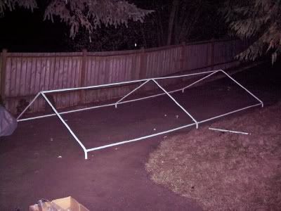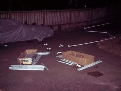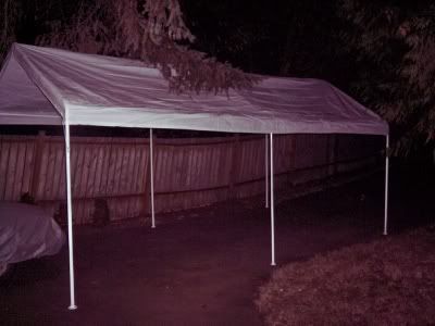 Car Canopy + Heavy Winds = Bad Reply #6 – March 19, 2010, 11:24:02 AM I will and then some.Like i said, I just wanted to get it set up and i made temporary precautions for it until i got around to actually placing it.I truly believed i would be fine weather wise to do this, And was proven terribly wrong.Live and learn, Wont happen again. :disappoinHere is some pics~Getting ready to set up, Middle of the night, Cleaned up the inches of tree debris and the weeds at the fence line during the day as well as mowed.BONUS! Pic of my "Elusive '84 Thunderbird" (Kinda ):Top Frame:All together minus sides: Quote Selected